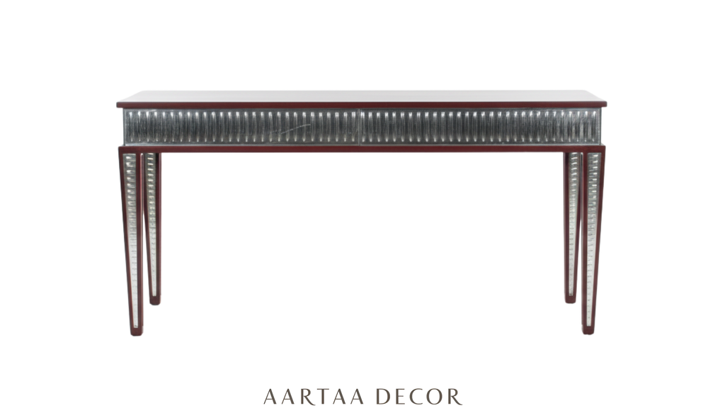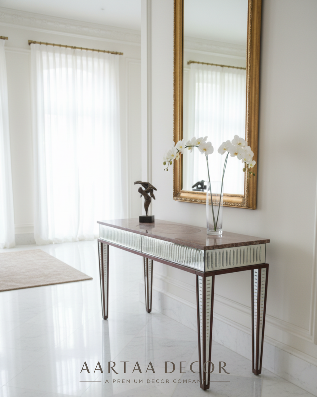 Its linear silhouette and ribbed glass detailing exude refined elegance, making it the perfect statement for luxury living rooms, hallways, or boutique interiors. Every inch of this table embodies Aartaa Decor’s signature blend of heritage, design, and artisanal perfection — crafted to make your space truly unforgettable.