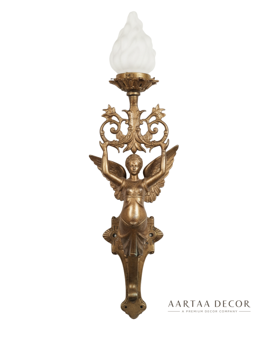 Each piece is handcrafted by Indian artisans using solid brass, sculpted into a timeless angelic form that holds a delicate flame-shaped glass shade — symbolizing purity and positive energy. The brass surface is gently aged to reveal its natural antique beauty, reflecting the soul of Indian craftsmanship blended with contemporary luxury.