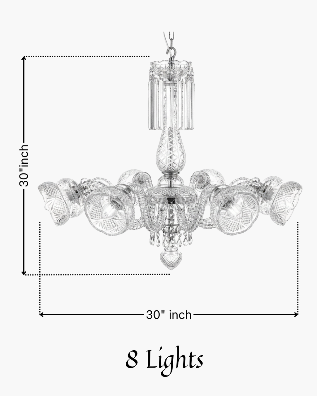 When illuminated, the eight lights disperse a warm, radiant glow through the crystal, producing a refined play of light and shadow — dramatic yet balanced, opulent yet restrained.