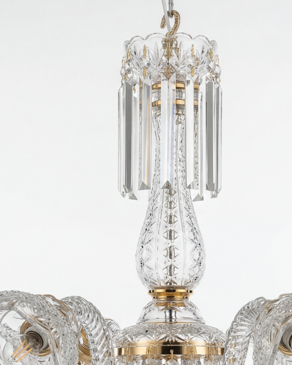 Each chandelier is composed of meticulously hand-cut crystal glass arms, gracefully curved and layered to create depth, brilliance, and movement. The crystal elements are anchored by a solid brass core, precision-engineered for strength while maintaining visual elegance.