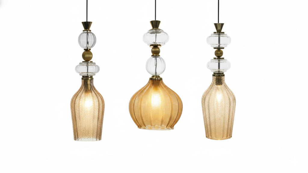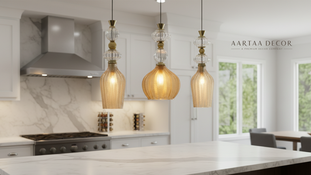 The soft amber tone of the glass diffuses a calming, ambient glow — perfect for kitchens, dining areas, or lounge spaces. Every curve and detail reflects the soulful artistry that defines Aartaa Decor, making this trio not just lighting but a statement of cultural refinement and craftsmanship.
